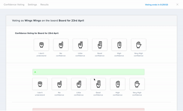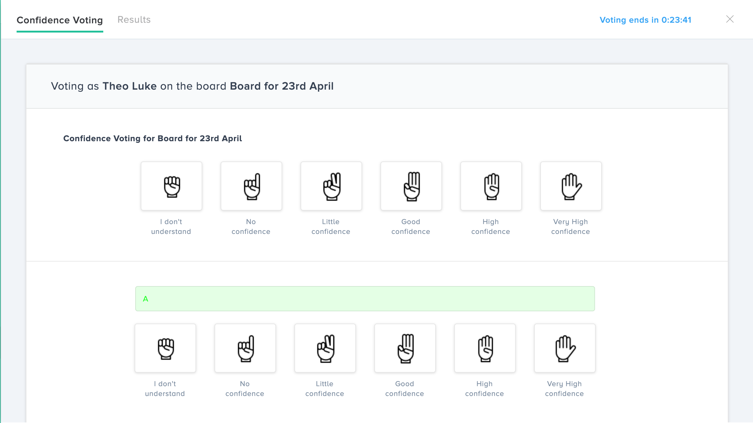 A button shall be visible on the top, next to the Board View Selector that will show that the voting is in progress. When that is clicked the screen for voting shall be displayed. You can select from the following five options.
