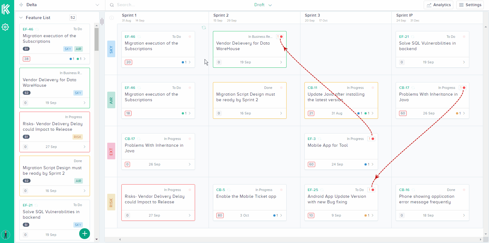 Larger organizations tend to use a mix of agile project management tools to manage and track the progress of their project. Atlassian’s Jira is often popularly used. But since there are other tools being used at the same time, the work is scattered and there are problems coordinating all of their work on to one tool. As for dependencies, Jira only displays the link type that is associated with the feature. There is no way of properly visualizing it is connected with is counterpart or how they are drawn which makes it cumbersome for the user to interpret.This is where Kendis presents a solution and an upper hand over Jira.