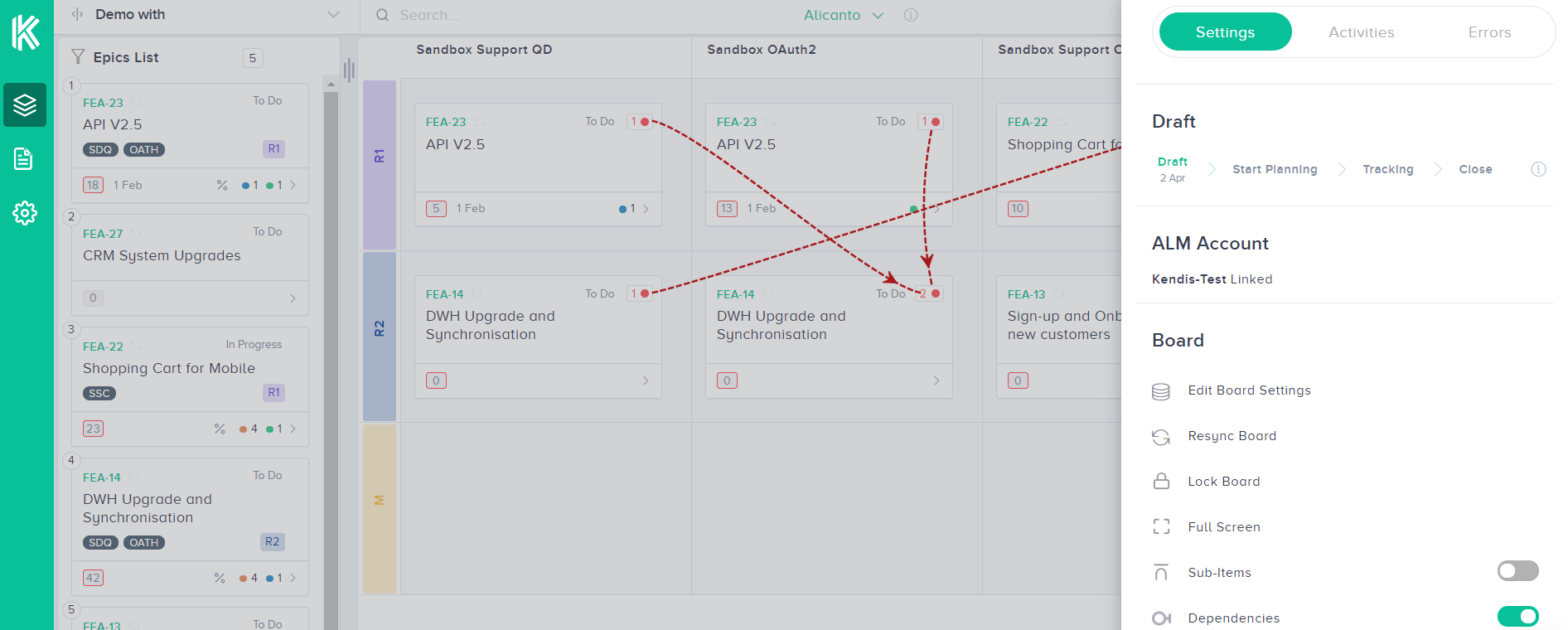 Kendis gives the complete view of your entire Program Increment (PI) or sprints on its highly customizable boards. Every board in Kendis has four states (Draft, Planned, Tracked, Closed) which effectively present the progress of the board at each level. These states help in guiding the execution of the Program Increment. The progress of the PI at each state is saved and maintained with the features’ statuses, dependencies, estimates etc, intact.