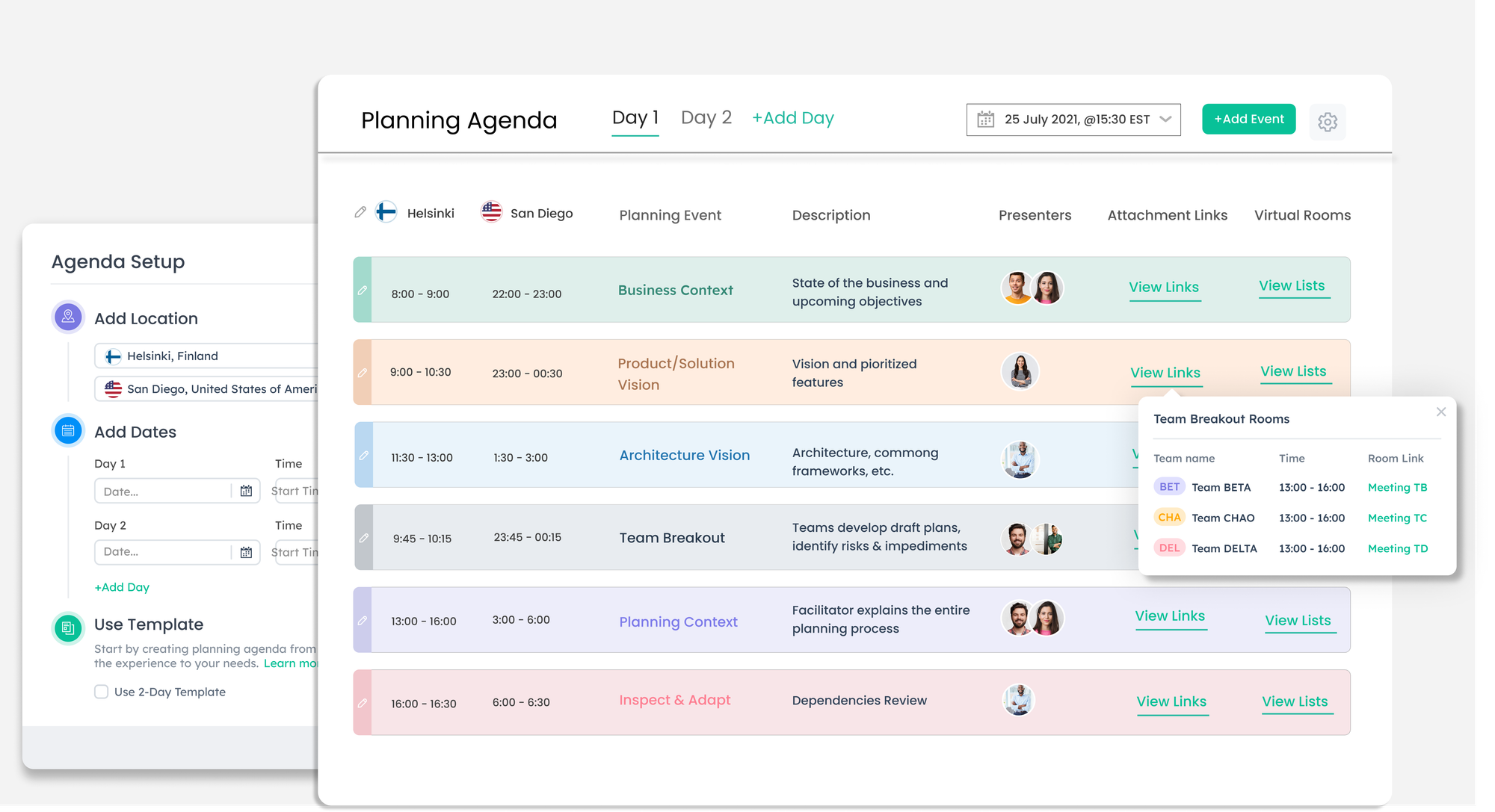 - Facilitation Suite: Includes a centralized Live Planning Agenda for distributed teams, facilitating the entire 2 day event with real-time Capacity vs. Load calculations, and digital Confidence Voting.