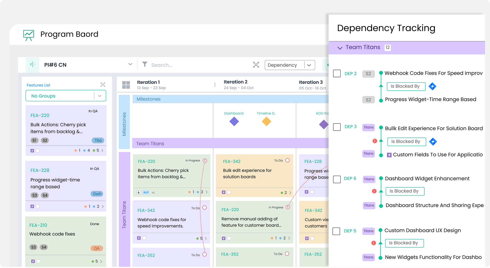 - Intelligent Dependencies: Visualizes dependencies across teams and Agile Release Trains (ARTs). The system highlights conflicts (e.g., circular dependencies or scheduling errors) automatically.
