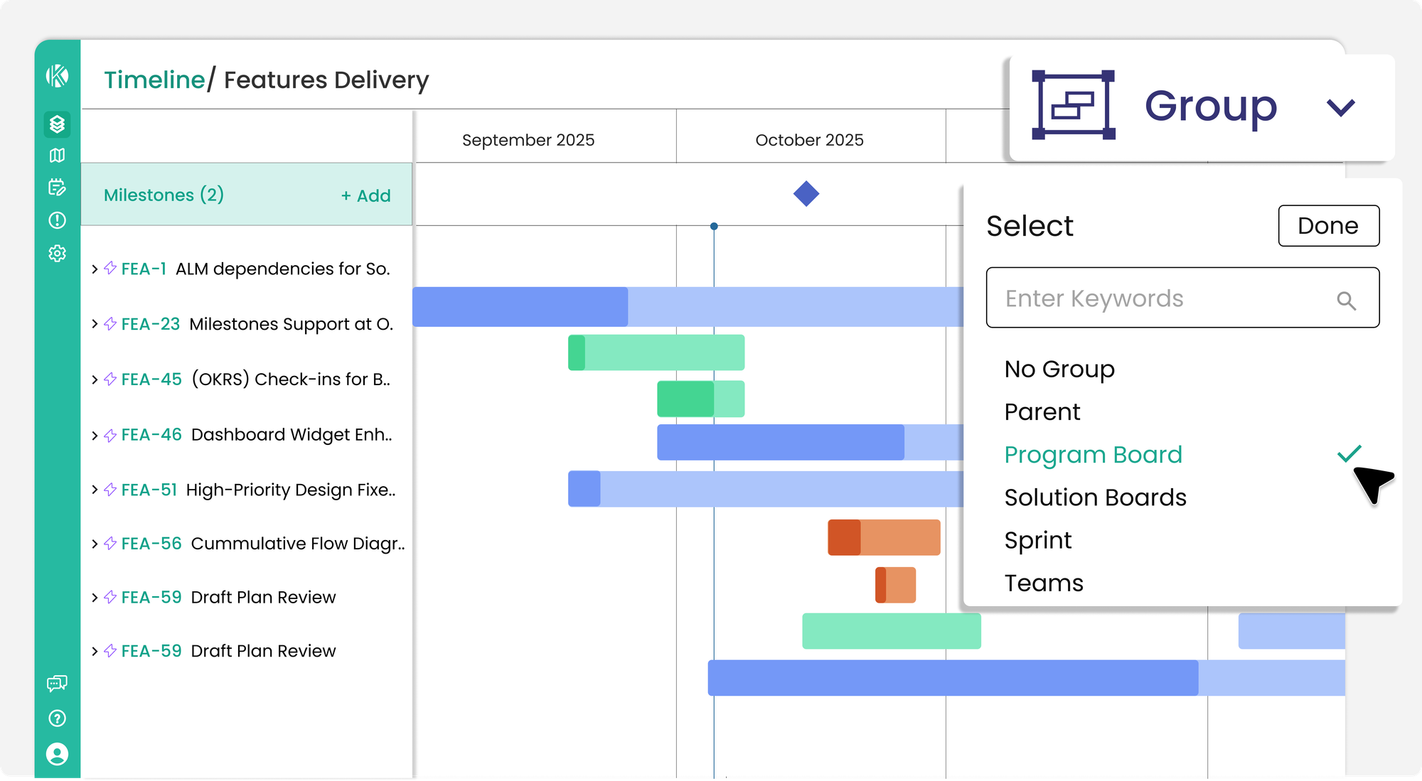 - Timeline View: Provides a comprehensive, visual, and date-oriented perspective of all features and their underlying user stories within the current Program Increment (PI). With a powerful group by filter that dynamically organizes work items (features, stories) by various criteria like Team, Assignee, Area Path, Custom Fields (e.g., Quarters, Tags), or Objectives.