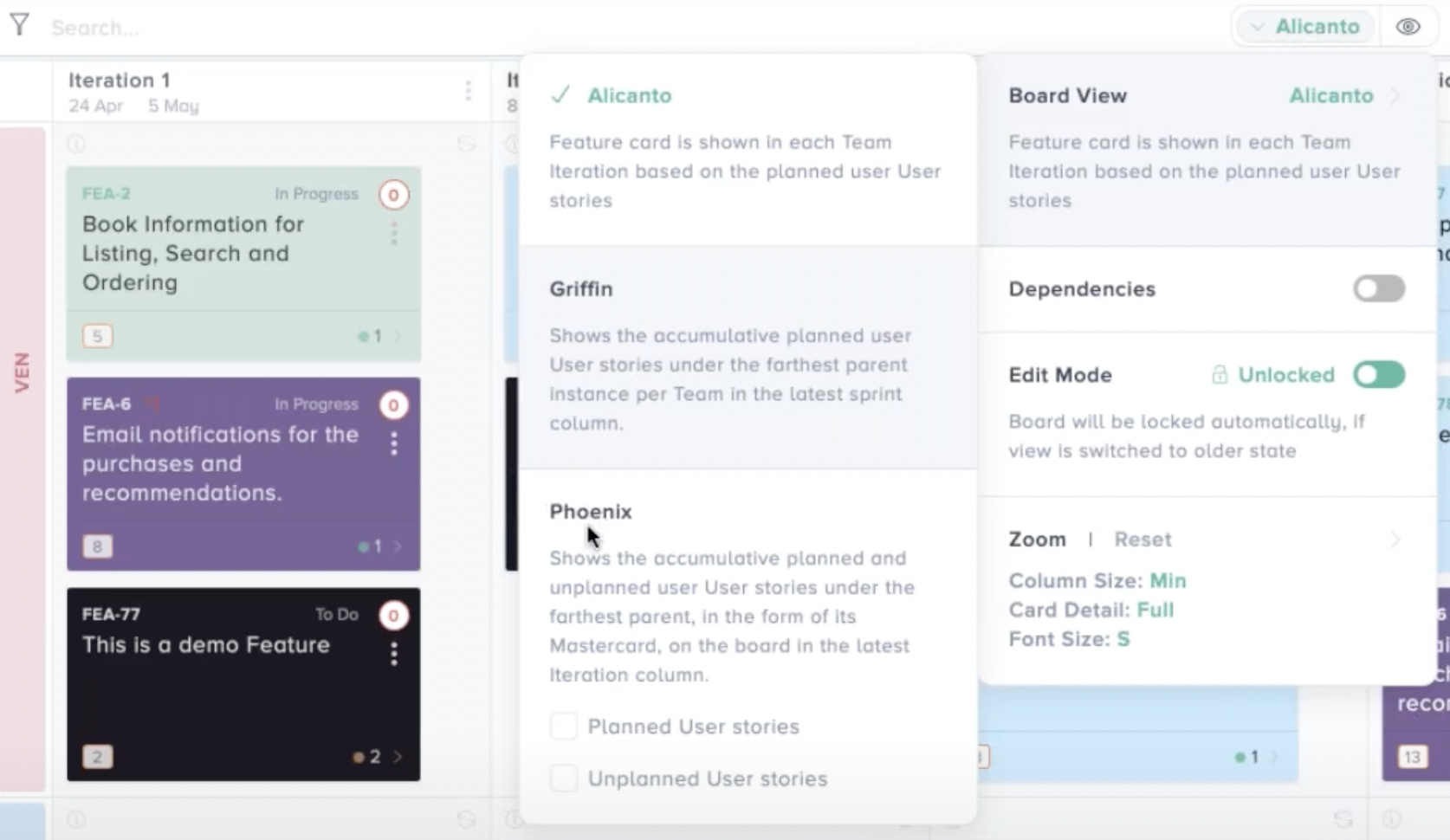 Alicanto is default view in Kendis and allows you to see, by team, the stories that are being worked on in a sprint, and on a higher level you can see features being worked on.