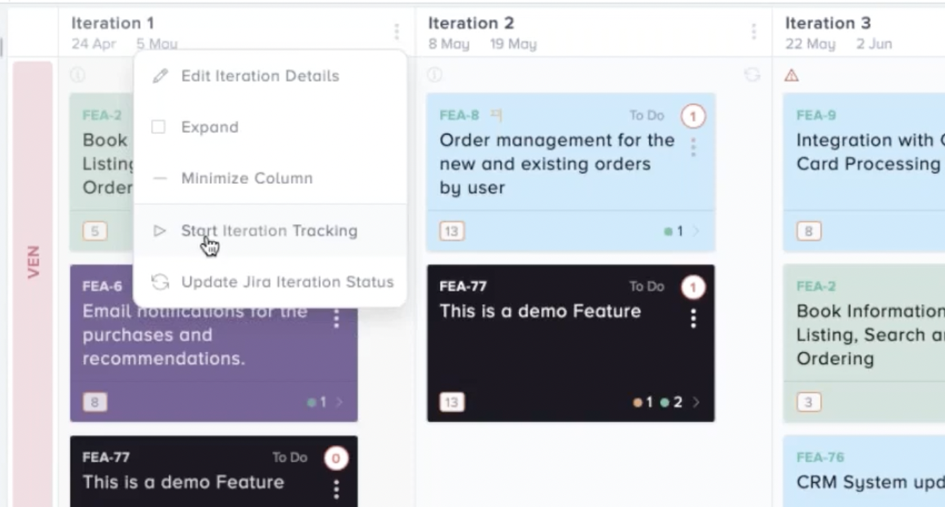 People may not know this, but you should start and stop sprints/iterations in Kendis by clicking on the tree dots next to the work sprint/iteration. This automatically updates from Jira if your webhook works, but it is not a feature shown in Azure yet, so you have to do it manually in Kendis. This helps you keep track of changes being made, stories being moved across sprints, and Kendis can give early warnings of where attention is needed.