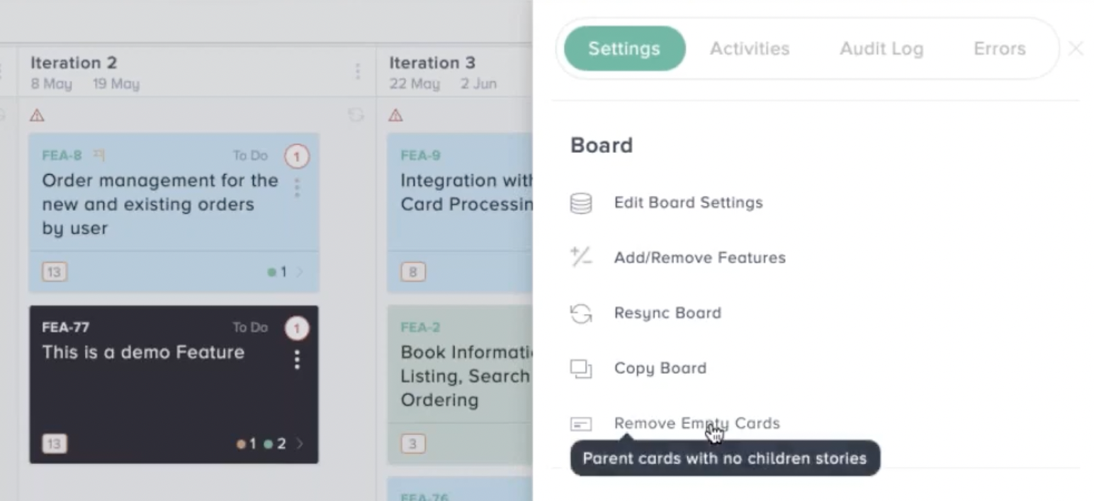 Go into the board settings and remove empty cards. This bulk move will delete all the blanks. These blanks are created when you move stories and create new feature cards. Some people use the blanks to track changes, but for others it can be helpful to remove all blanks and prevent false indications of stories and features on your board.