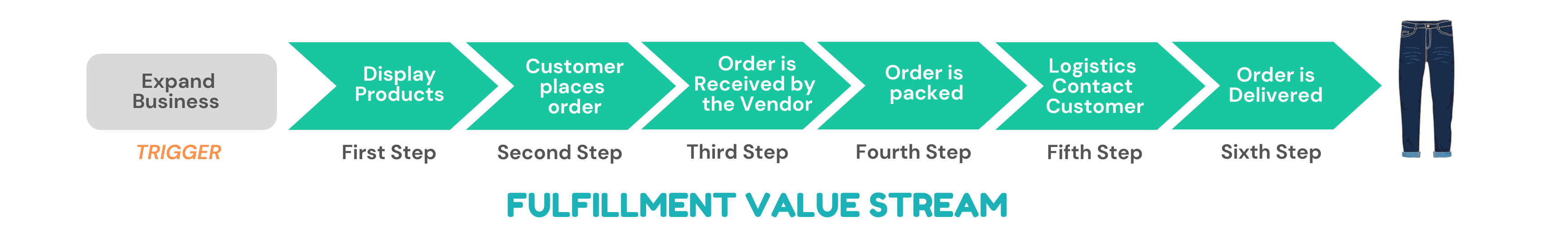 - Fulfillment Value Stream:Consists of the steps necessary to fulfill a customer’s request. An example of this could be, a customer orders a pair of jeans online and that order is fulfilled by delivering to the customer.
